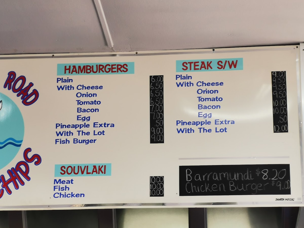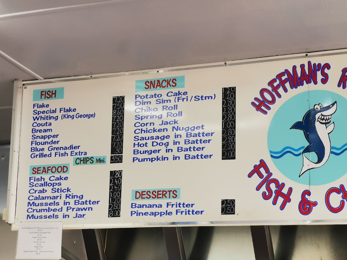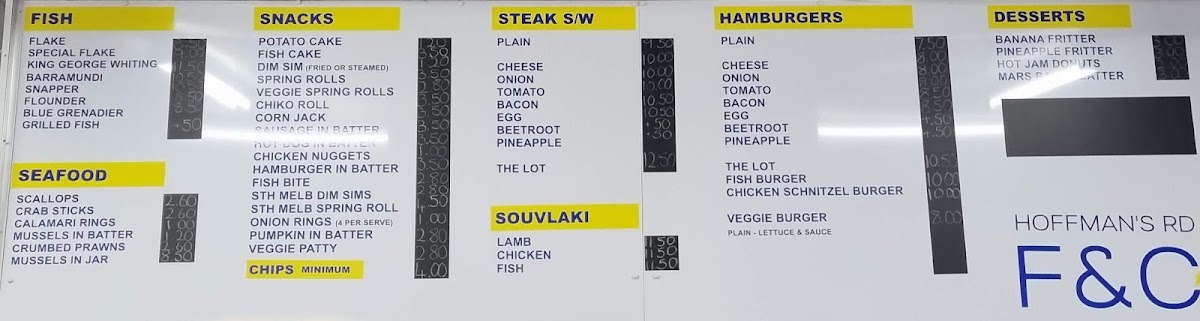 The menu at Hoffman's Road Fish & Chips offers a diverse selection of delicious options, catering to a variety of tastes. For seafood lovers, dishes like Fish Cake, Scallops, Crab Stick, and Calamari Ring stand out, while Mussels in Batter provide an extra indulgence. The snacks section features familiar favorites like Potato Cake, Dim Sim, and Chiko Roll, alongside options like Spring Roll and Corn Jack. For those with a sweet tooth, there are delightful desserts such as Banana Fritter and Pineapple Fritter. The fish selection includes popular choices like Flake, Special Flake, King George Whiting, Barramundi, and Snapper, each bringing its unique flavor. The menu also includes hearty Steak S/W options, available in variations like Plain, Cheese, Onion, Tomato, and Bacon. Fans of grilled meat can enjoy Lamb, Chicken, or Fish in the Souvlaki range, while the Hamburgers, available in Plain, With Cheese, Onion, Tomato, and Bacon versions, offer a satisfying meal. Rounding out the menu are other seafood options like Couta and Bream, providing even more variety for seafood enthusiasts. With such an extensive array, Hoffman's Road Fish & Chips is sure to satisfy a range of cravings, all at affordable prices.